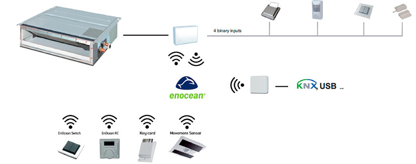 - блок кондиционера может управляться одновременно с помощью ИК-пульта дистанционного управления и устройств EnOcean