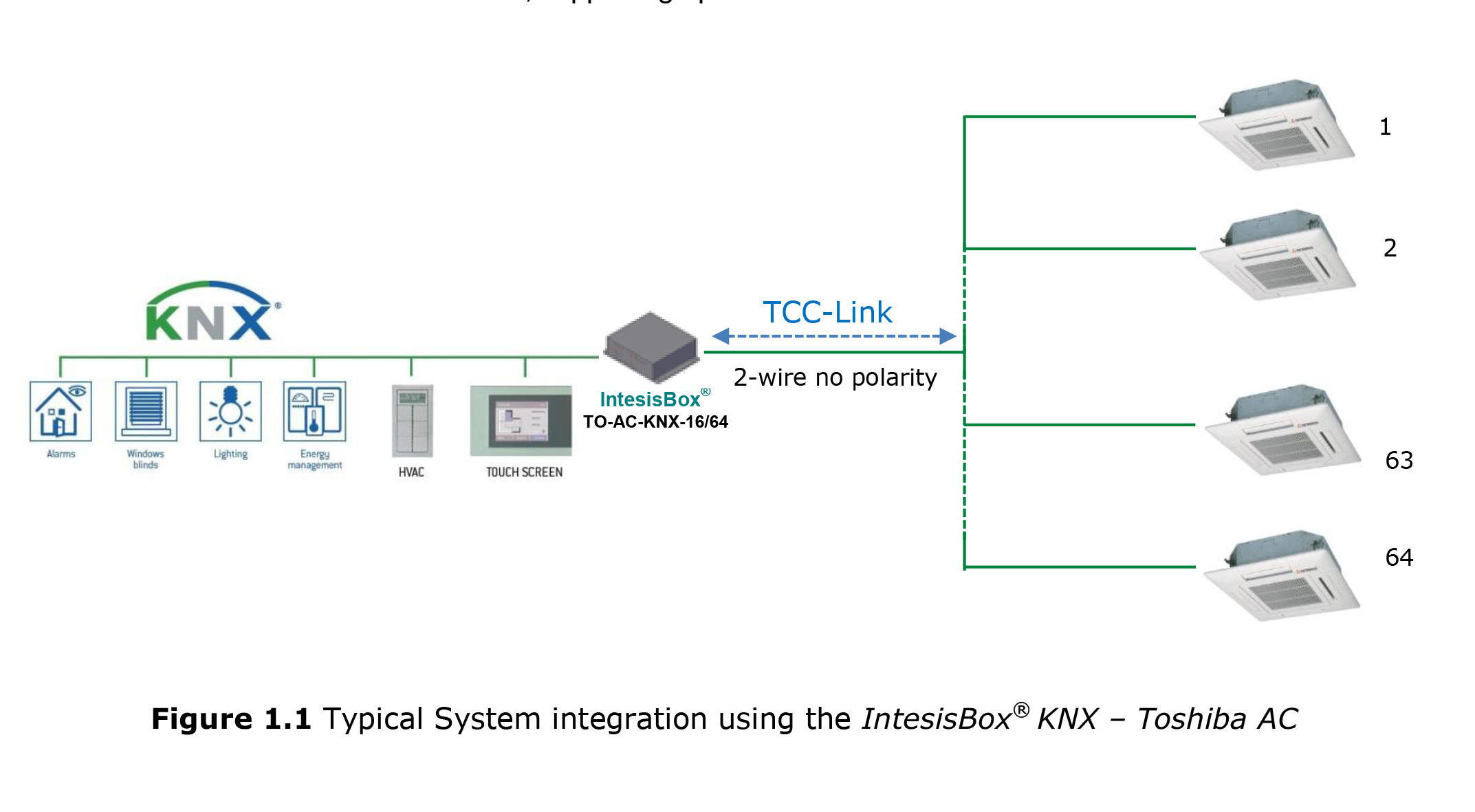 IntesisBox® TO-AC-KNX-64 обеспечивает двунаправленное управление всеми параметрами кондиционеров Toshiba из KNX. Шлюз постоянно проверяет (считывает) по TCC-Link сконфигурированные сигналы и сохраняет статус всех из них в своей памяти, готовых к отправке по запросу KNX.