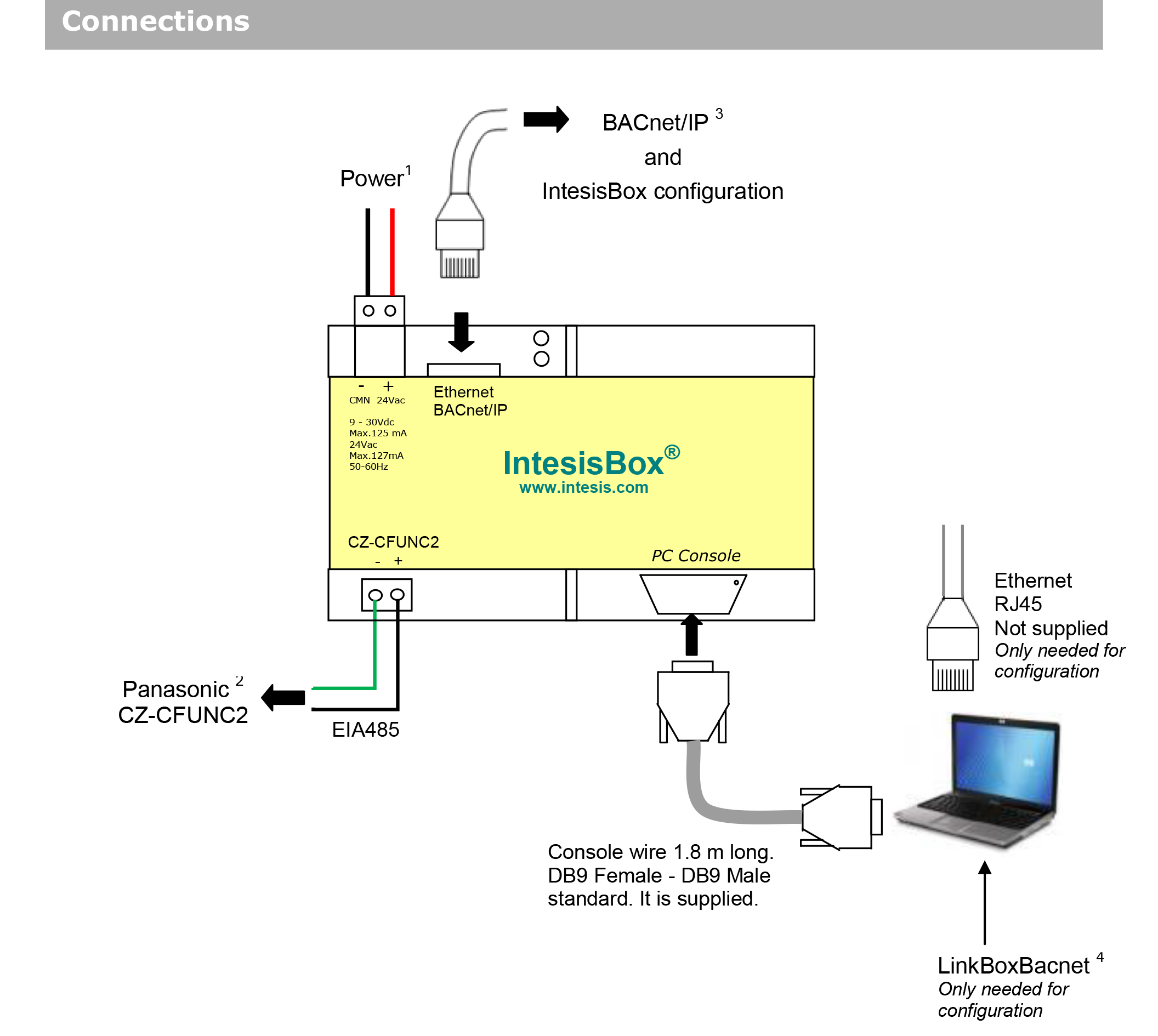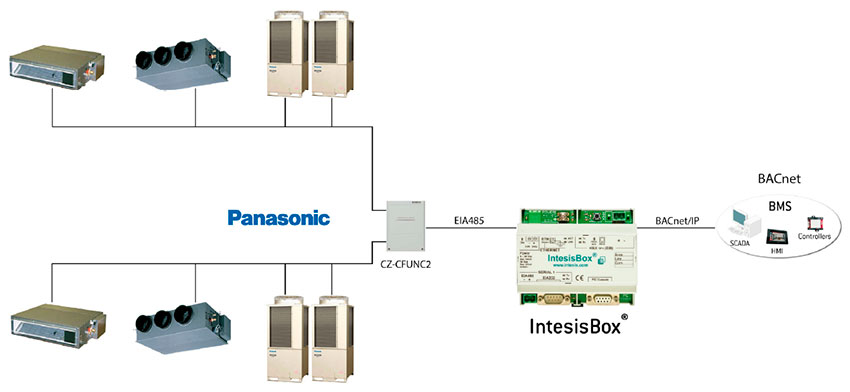 PA-AC-BAC-128 специально разработан для двунаправленного управления и мониторинга всех параметров и функциональных возможностей серверных устройств систем Panasonic VRF через адаптер CZ-CFUNC2 от BMS, SCADA или любого другого устройства BACnet. Целью интеграции является мониторинг и управление системой кондиционирования Panasonic, удаленно, из центра управления с использованием любого коммерческого программного обеспечения SCADA или мониторинга, которое включает драйвер BACnet / IP. Для этого IntesisBox позволяет осуществлять связь BACnet / IP, выступая в качестве сервера, разрешая запросы на опрос или подписку (COV).