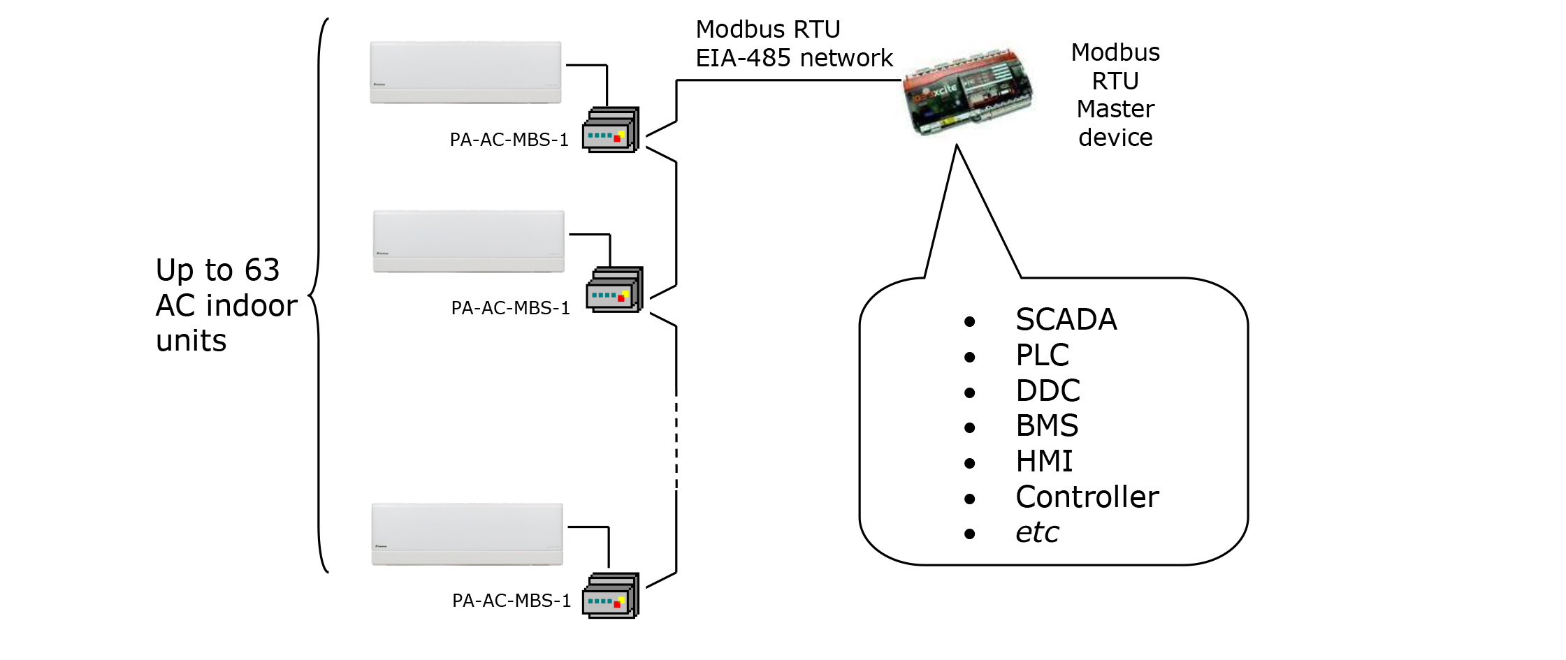прямое подключение к сетям MODBUS RTU (RS-485), в одну сеть можно подключить до 63 устройств PA-AC-MBS-1