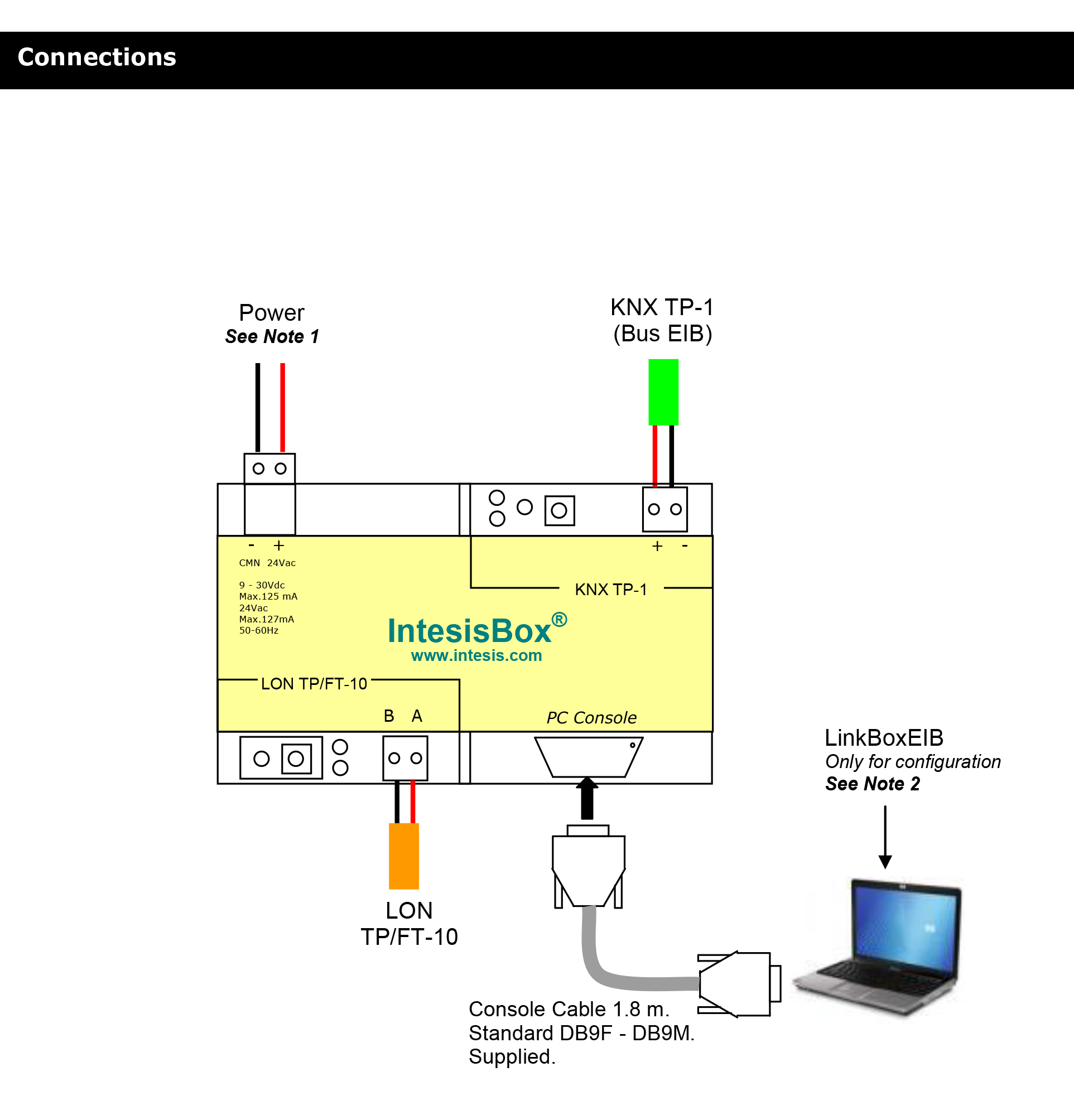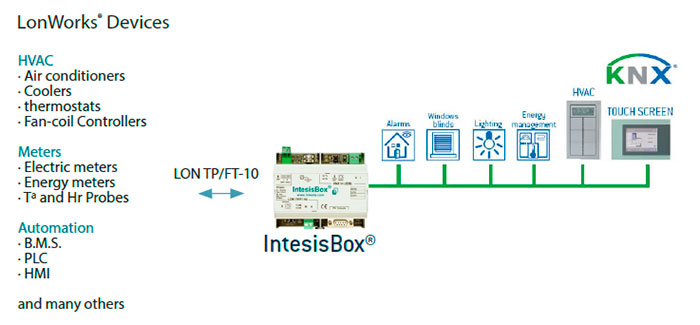 Устройство LonWorks, позволяющее читать/записывать точки других устройств LonWorks, подключенных к сети LonWorks, и предлагать значения этих точек через интерфейс KNX/EIB. Интерфейс KNX EIB от IntesisBox подключается непосредственно к шине EIB и полностью изолирован от остальной внутренней электроники. Любая точка в IntesisBox может быть настроена индивидуально для разных функций.