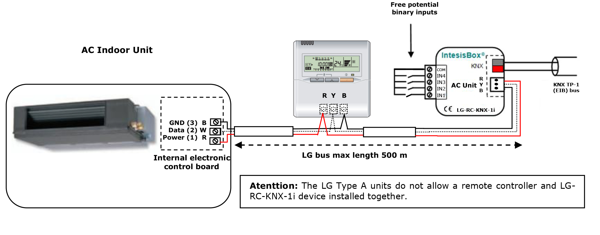 IntesisBox LG-RC-KNX-1i ( арт.INKNXLGE001R000 ) позволяет полностью контролировать все функциональные параметры кондиционеров LG VRF от установок KNX. Кроме того, четыре беспотенциальных двоичных входа обеспечивают возможность интеграции многих типов внешних устройств.