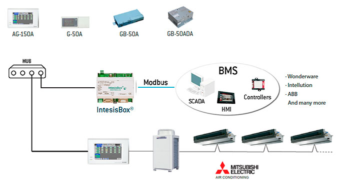 IntesisBox Gateway специально разработан для двунаправленного управления и мониторинга систем Mitsubishi Electric City Multi от BMS, SCADA, PLC или любого другого устройства, работающего в качестве Modbus Master.