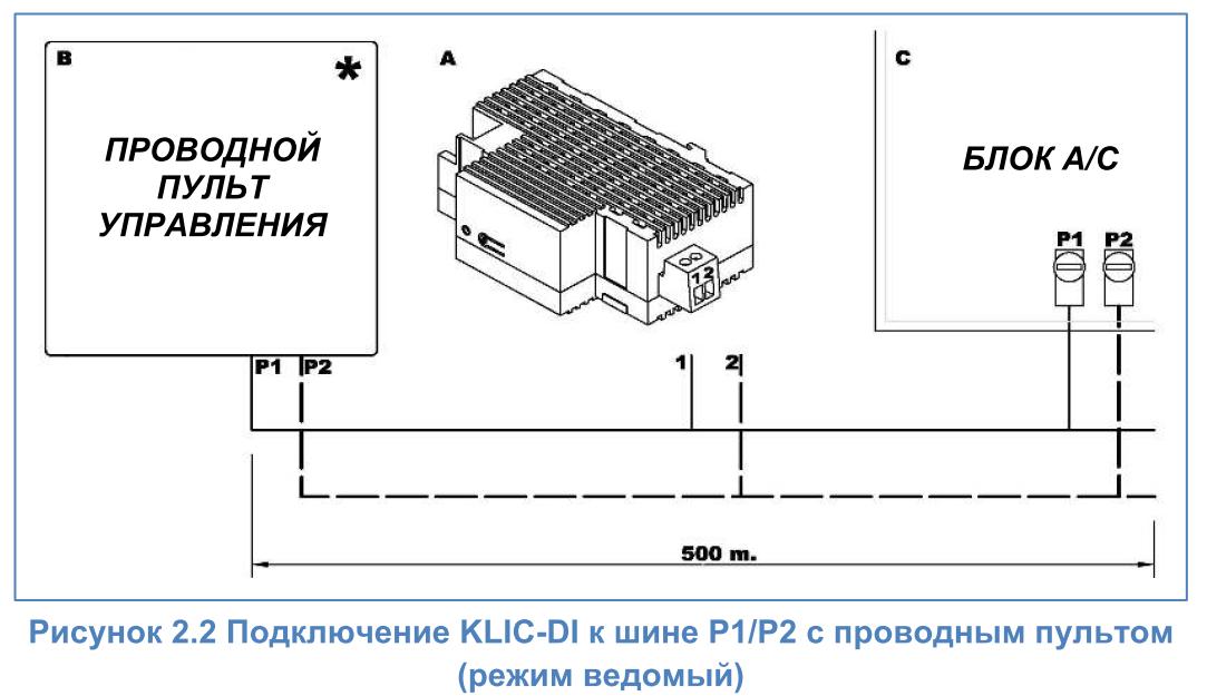 При подключении проводного пульта управления вместе с KLIC-DI на одну и ту же шину управления кондиционера, KLIC-DI будет взаимодействовать с пультом. При этом одно из устройств будет ведущим (master), а другое - ведомым (slave). Важно убедиться, что интерфейс KLIC-DI и проводной пульт сконфигурированы в разных режимах. В этом случае ведомое устройство будет менять свой статус в соответствии с командами ведущего (мастера), а также будет передавать свой статус в случае его изменения в результате собственного процесса управления.